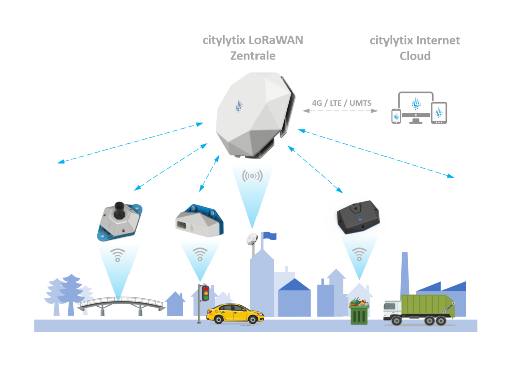 Eine „Smart City“ oder intelligente Gemeinde nutzt vernetzte Daten, um alltägliche Abläufe für Verwaltung und Bürger effizienter, sicherer und kostensparender zu gestalten. Unser neues citylytix LoRaWAN Gateway fungiert dabei als zentrale Übersetzer- und Sammelstation: Es fängt die Funksignale aller Sensoren in Ihrer Kommune auf und leitet diese sicher über das Internet an Ihre Auswertungszentrale in der Cloud weiter.